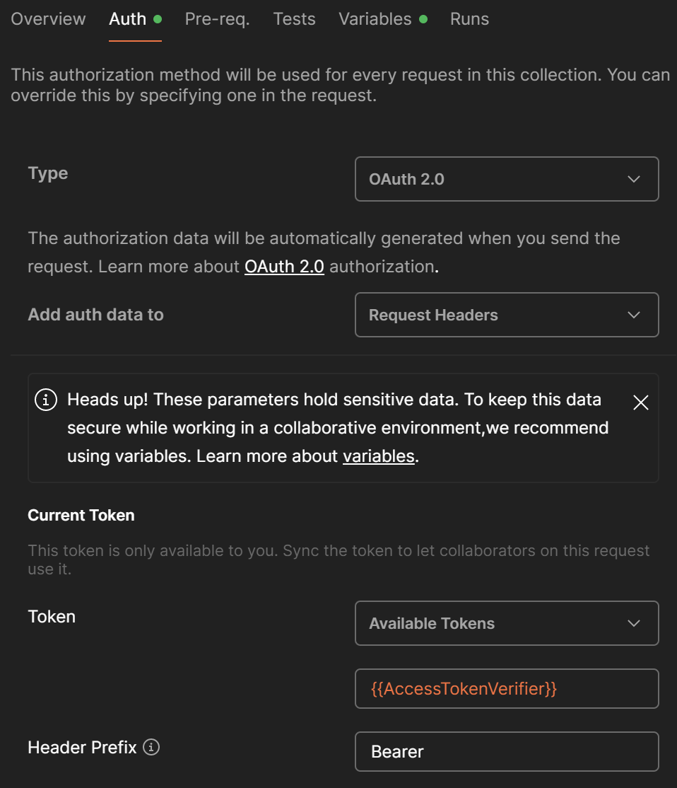 * Set the value of the Token with a variable (for example: <mark style="background-color:orange;">{{AccesTokenVerifier}}</mark>  ) at the Collection level, in the Authorization interface.