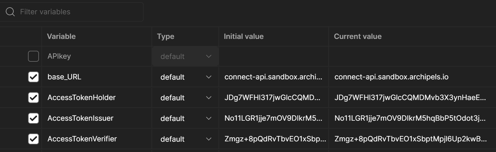 * Go back to the environment you set in the section "Create your test environment", and create a new variable <mark style="background-color:orange;">AccessTokenIssuer</mark> with the value of this accessToken you generated at the beginning of this section:&#x20;